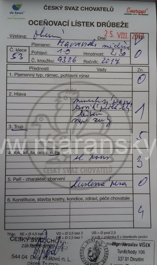 Vady: Nežádoucí kresba na prsou, dvojzuby, slabé opeření běháků, světlejší oči, struktura peří v krč. závěsu